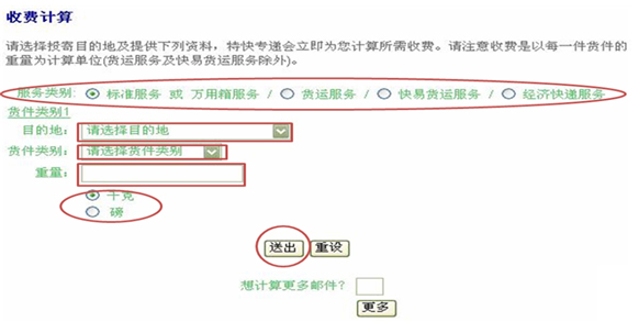 選擇相應的選項和填寫相應的內容,之后點擊送出,計算郵件的運費。