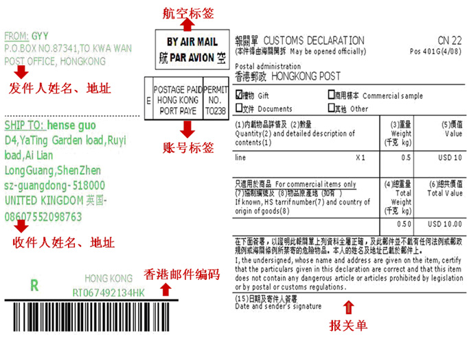 賬號(hào)標(biāo)貼+報(bào)關(guān)單+收件人姓名、地址+香港郵件編號(hào)+航空標(biāo)貼: